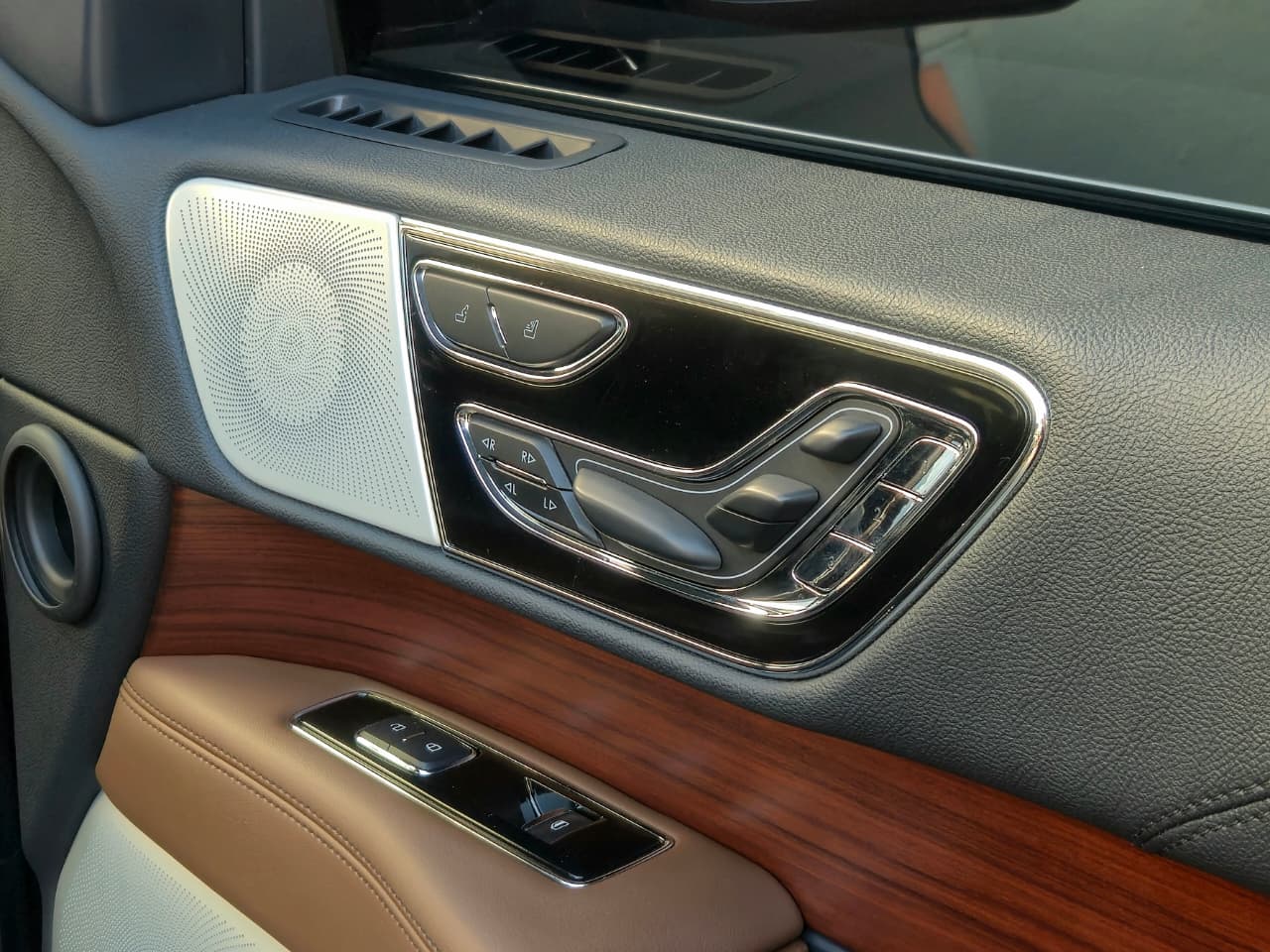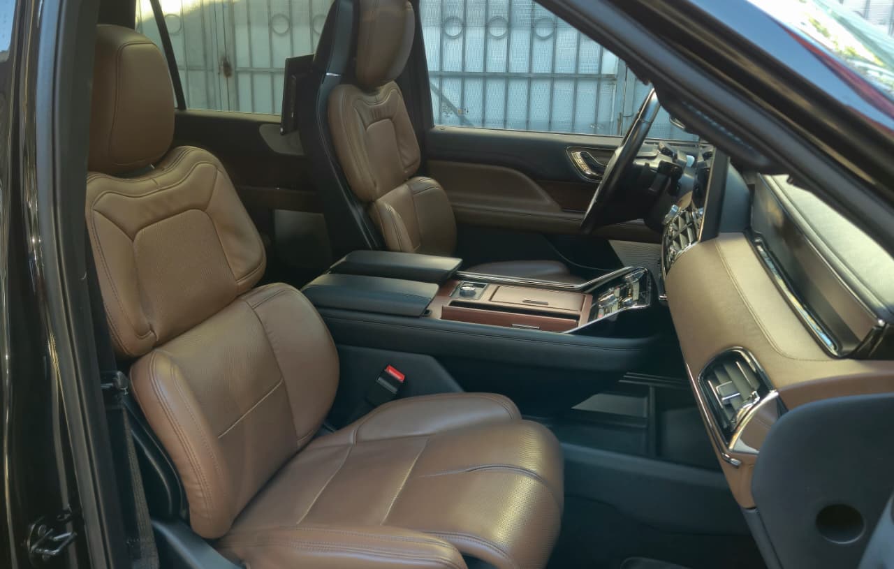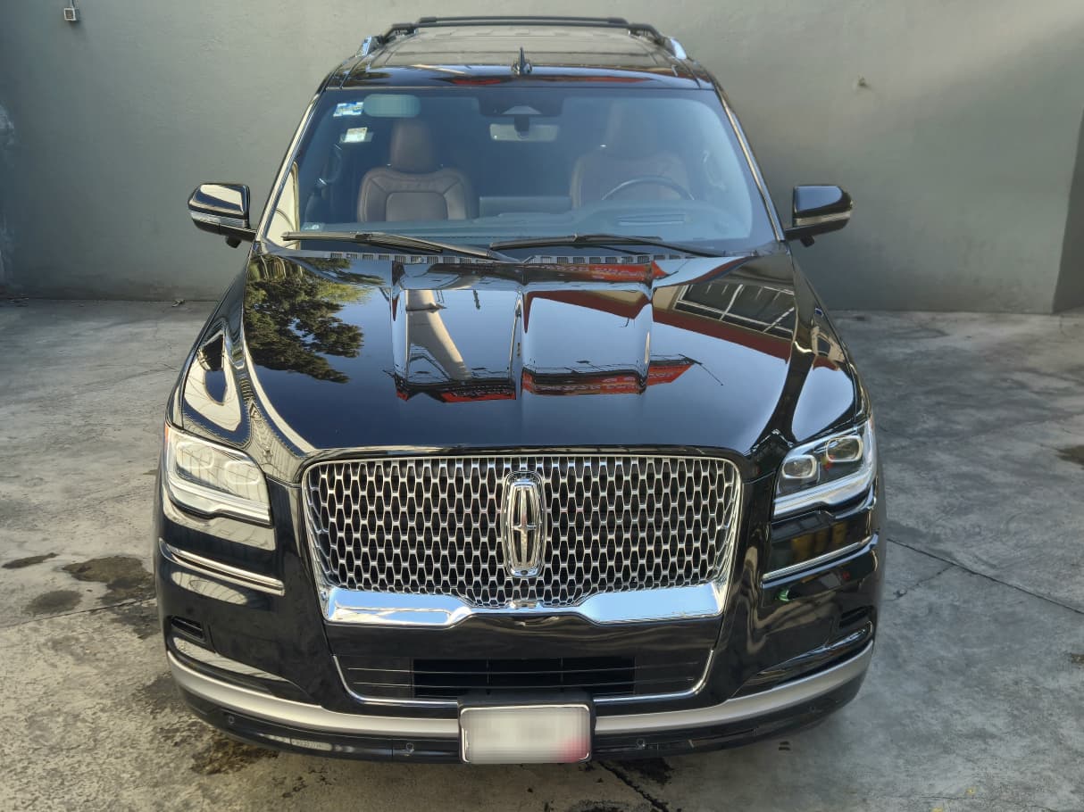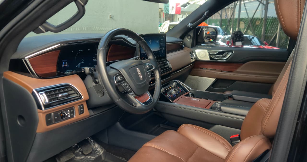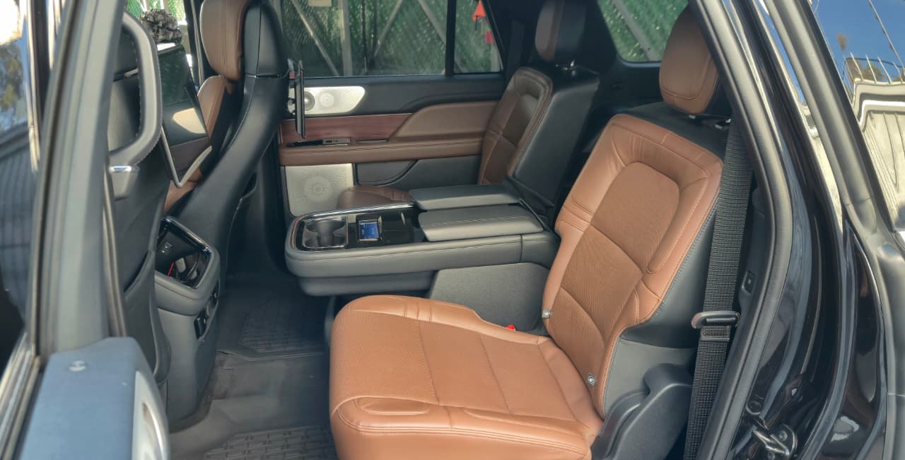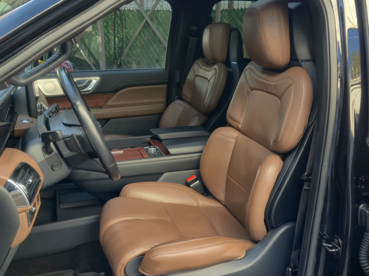 Exterior: Faros LED adaptativos, parrilla cromada Signature Lincoln, rines de aluminio de 22”, doble salida de escape, estribos eléctricos iluminados, techo panorámico Vista Roof y portón trasero eléctrico con función manos libres.